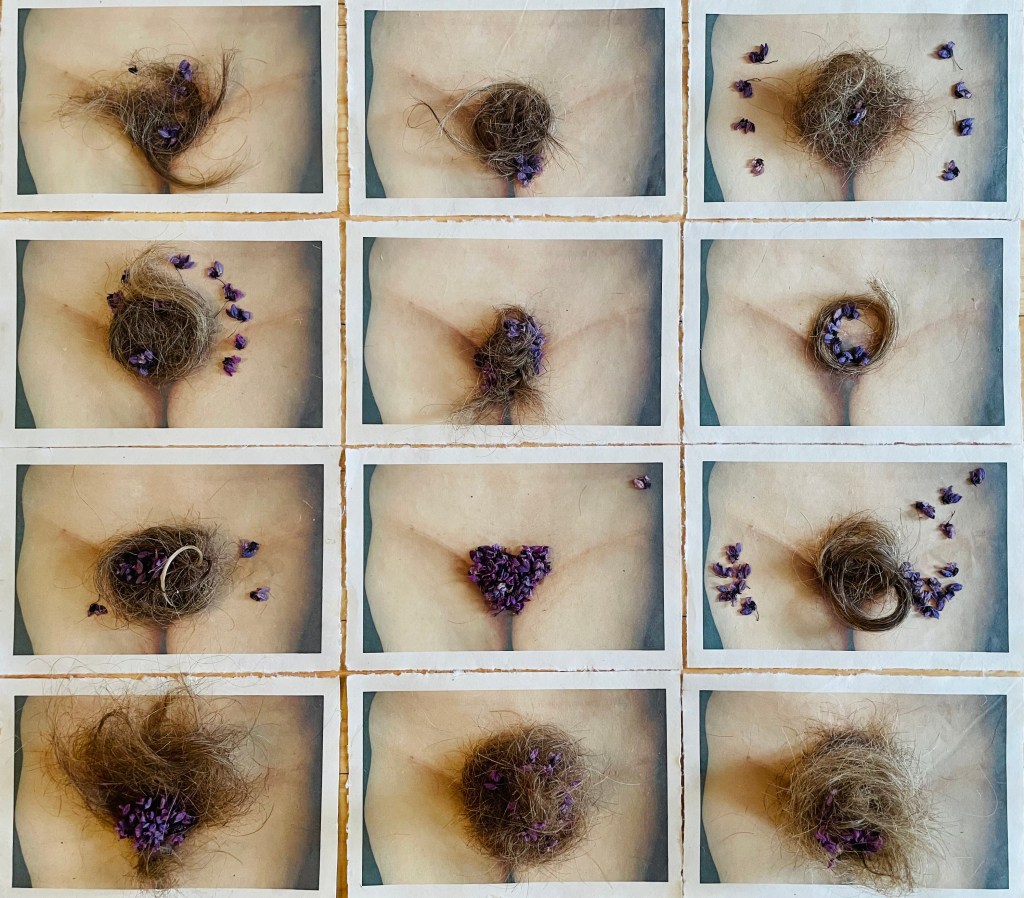 Unshaven… Again is a collection of self portraits printed on handmade paper and then adorned with the artist’s collected hair and dried flowers. The delicate paper along with dried flowers speaks to female sexuality and society’s notion of the fragility of women as a gender. The human hair is representative of Western culture’s criteria for traditional feminine beauty and its desire to keep women in a state of innocence.