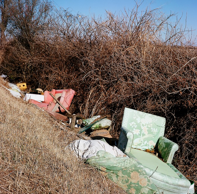 Driving down the AR-147 alongside Horseshoe Lake I see something bright green in a ditch on the side of the road. This small road does not have a proper shoulder, so I turn around, pull up on the grass, and park on the other side of the road. It becomes clear as I approach that the green object is a chaise lounge chair. Alongside the chaise lounge are several more chairs and a number of other household items. Had someone decided to use this as their own personal dumping ground? It feels as if a person’s whole life has been left discarded on the side of the road, but why?