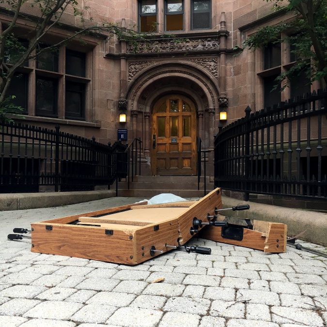 Walking with my family and some friends through the campus of Yale University, we come to the secluded courtyard of Vanderbilt Hall. Our kids are running around and climbing on everything when we notice the broken foosball table resting underneath a beautiful tree. This being a Saturday “morning” it is pretty quiet except for a few visitors wandering around the Old Campus. I doubt this is an art installation as there are a few other discarded objects and pieces of trash strewn about the courtyard. Therefore, I must ask…what happened last night for the table to incur such damage?